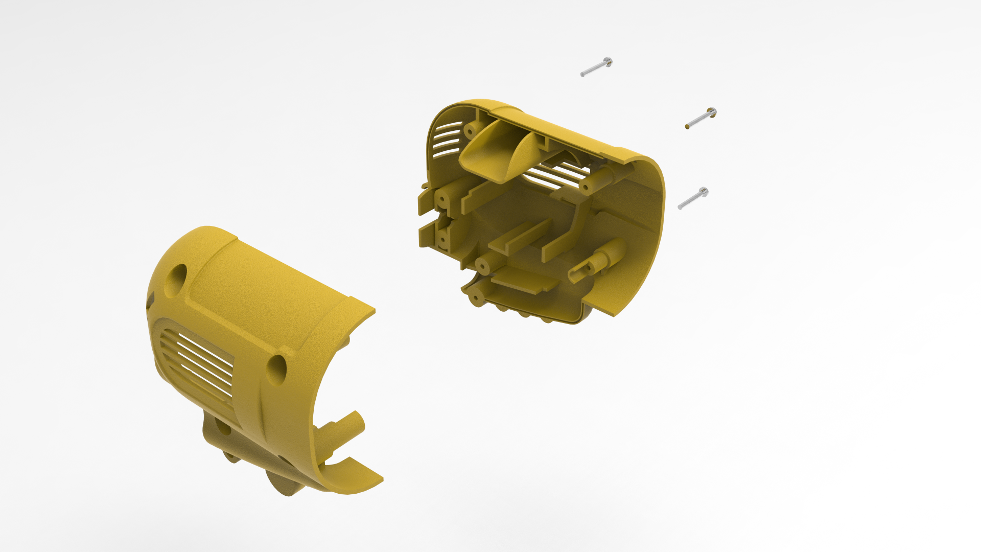 As medidas da furação dos parafusos que conectam as duas carcaças são fundamentais para garantir uma montagen correta e robusta. Durante a fase de modelação, determinou-se com precisão a localização e o diâmetro dos furos. Um erro nesta etapa pode levar a um mau alinhamento das partes, resultando em falhas operacionais..
